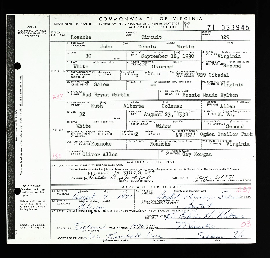 - Image 3 - Marriage Return between John Dennis Martin and Ruth Alberta Coleman, dated August 7, 1971.