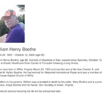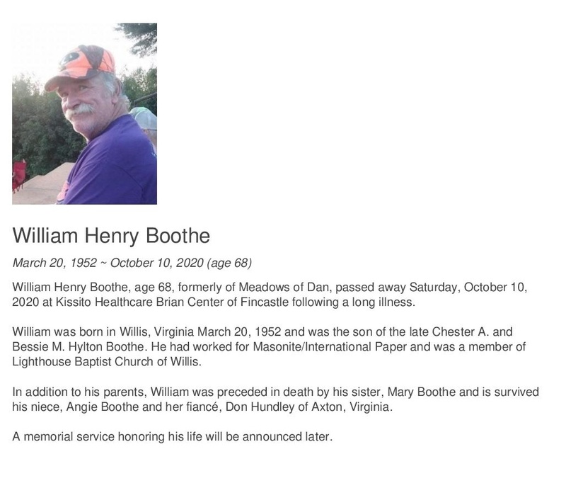 - William Henry Boothe was born in Willis on March 20, 1952 to Chester A. and Bessie M Hylton Boothe. He died on October 10, 2020.