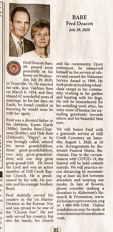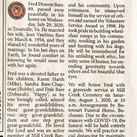 - Fred Deacon Bare was born September 2, 1930, to Lester A & Grace Deacon Bare. He married Jean Vanness Bare in 1954. His children includ Karen Harth, Sandra Bare-Chapman, and Dale Bare. He died July 29, 2020, and is buried at Mill Creek Cemetery.