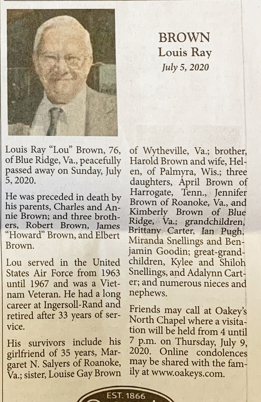- Louis Ray "Lou" Brown, of Blue Ridge, was born to Charles and Annie Brown. He was in a relationship with Margaret N. Salyers. He has three children, April Brown, Jennifer Brown, and Kimberly Brown. Louis Brown died on July 5, 2020.