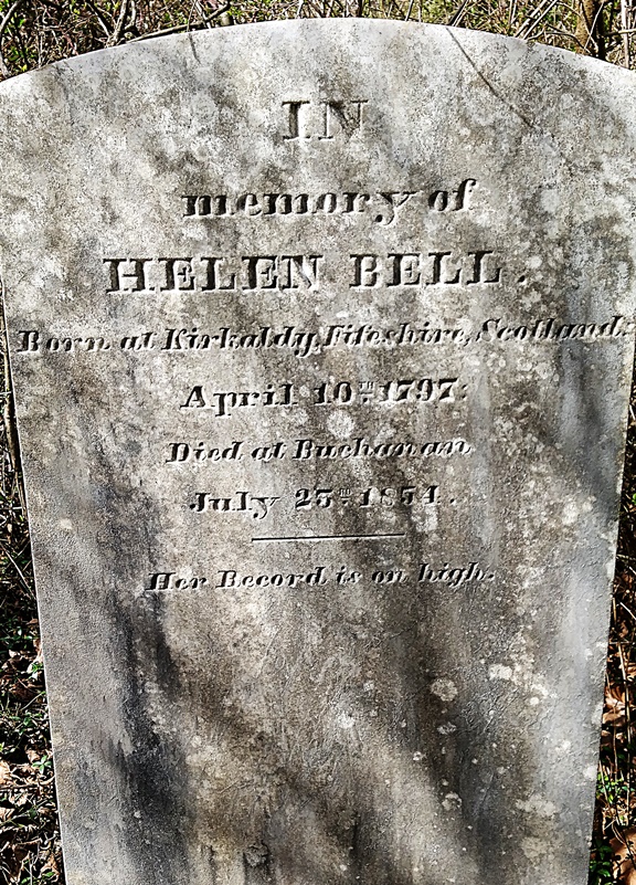 - Helen Bell was born in Kirkaldy, Fife, Scotland, in 1797. She died in Buchanan in 1854 at the age of 57 years, 3 months, and 15 days, and is buried in Boyd Cemetery.