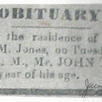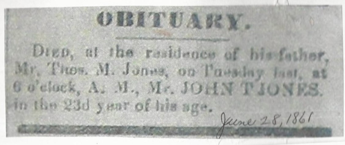 - An obituary, hand-dated June 28, 1861, which reads, "Died, at the residence of his father, Mr. Thos M. Jones, on Tuesday last, at 6 o'clock, A. M., Mr. JOHN T JONES in the 23d year of his age."