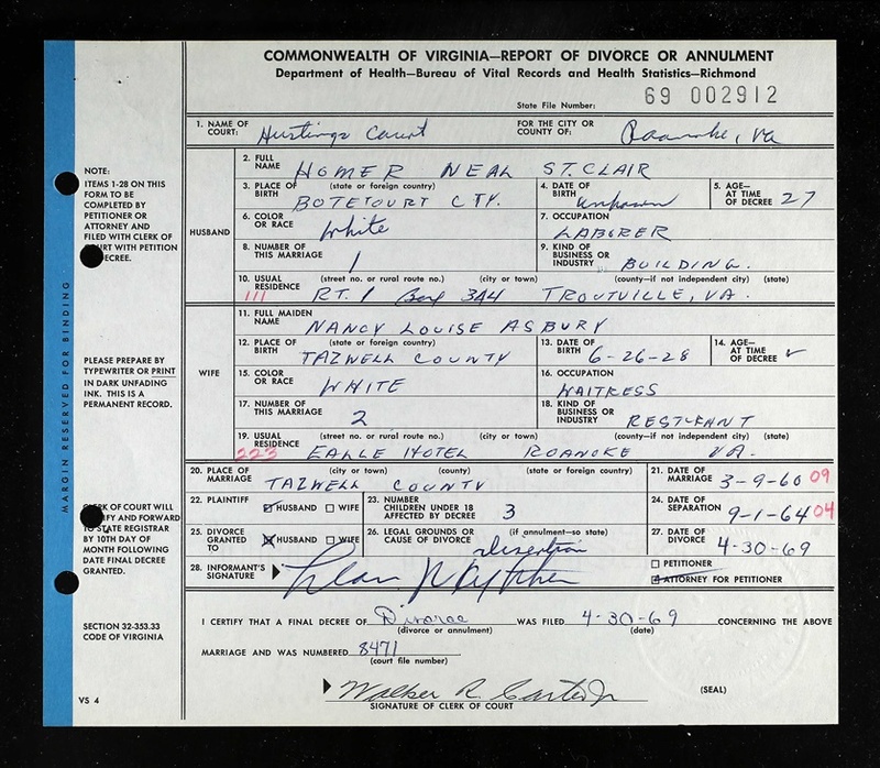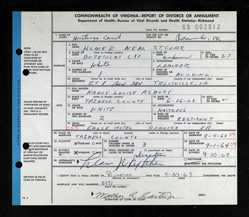 - Image 3 - Report of Divorce or Annulment between Homer Neal St. Clair and Nancy Louise Asbury, dated April 30, 1969.