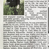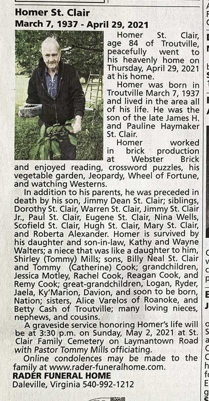 - Homer Neal St. Clair was born to James Hubert Bowyer St. Clair Sr and Pauline Marie Haymaker St. Clair. He married (and divorced) Nancy Louise Asbury McCullough. He had a son, Jimmy Dean St. Clair, and a daughter, Kathy Walters. He died April 29, 2021, and is buried in Saint Clair Cemetery. He lived in Troutville.
