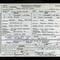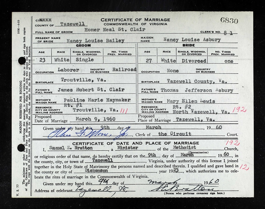 - Image 2 - Certificate of Marriage between Homer Neal St. CLair and Nancy Louise Bailey (nee Asbury), dated March 9, 1960.