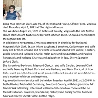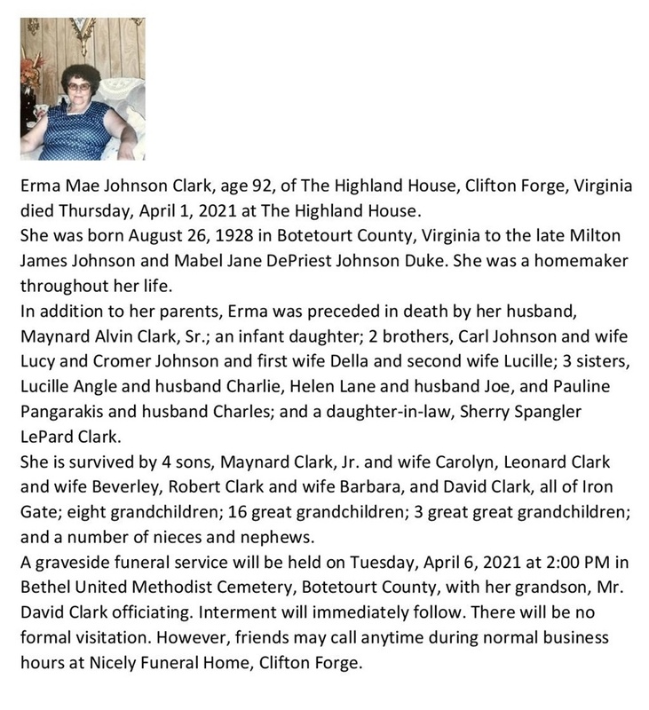 - Erma Mae Johnson Clark was born on August 26, 1928 in Botetourt County. She married Maynard Clark Sr. in 1946. They had five children, an infant daughter, Maynard Clark, Jr., Leonard Clark, Robert Clark, and David Clark. Erma Clark died on April 1, 2021. She is buried in Bethel United Methodist Cemetery. She lived in Clifton Forge.
