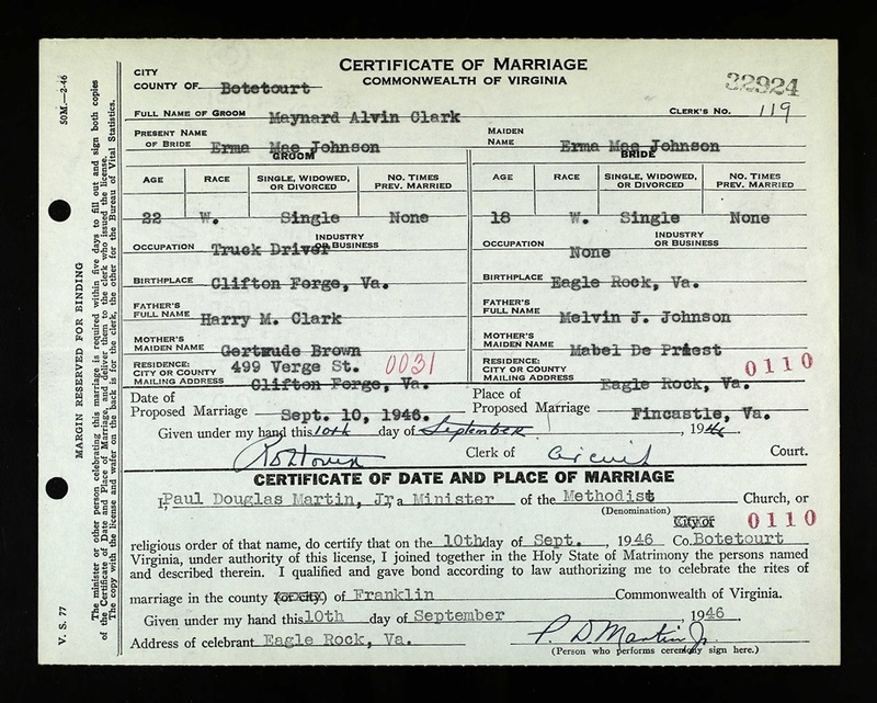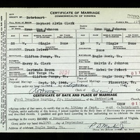 - Image 3 - Certificate of Marriage between Maynard Alvin Clark and Erma Mae Johnson, dated September 10, 1946.