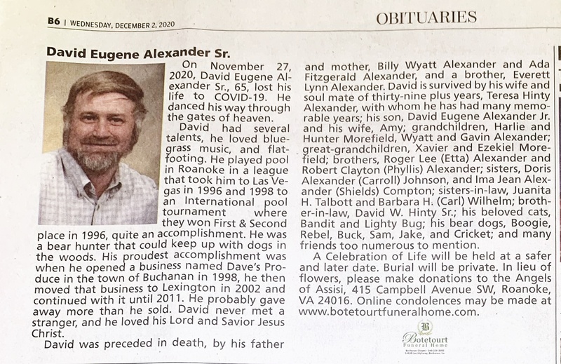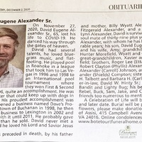 - David Eugene Alexander Sr. was born to Billy Wyatt Alexander and Ada Fitzgerald Alexander. He married Teresa Hinty Alexander. They had one child, David Jr. David Alexander, Sr. died on November 27, 2020. He was buried in Broad Creek ARP Church Cemetery.