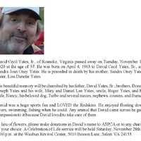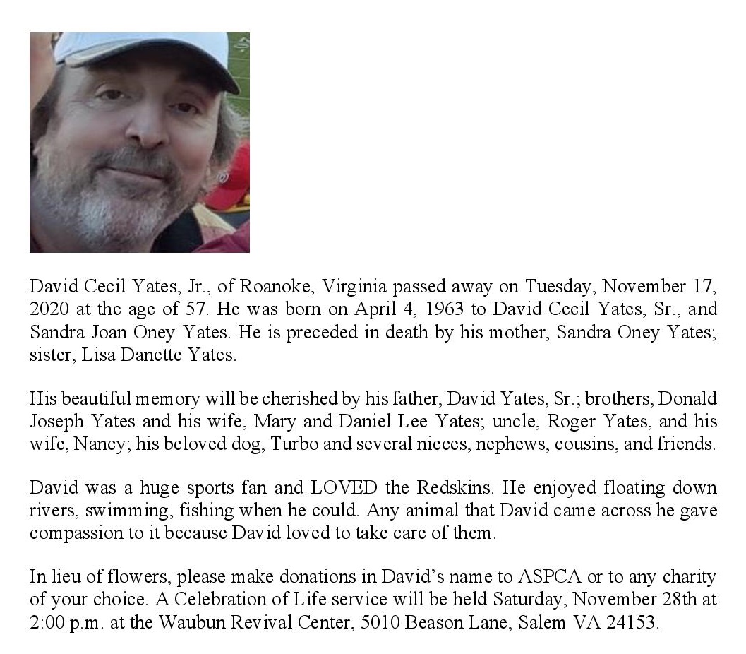 - David Cecil Yates, Jr., of Roanoke, was born on April 4, 1963 to David Yates Sr. and Sandra Yates. He died on November 17, 2020.