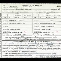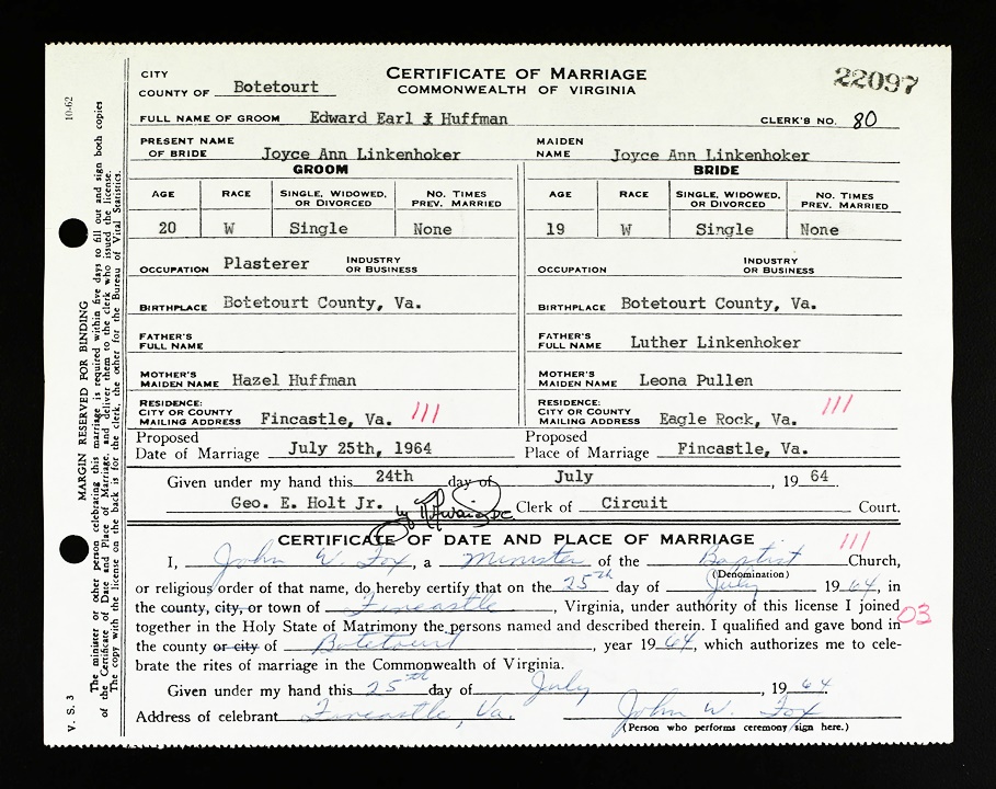 - Image 3 - Certificate of Marriage between Edward Earl Huffman and Joyce Ann Linkenhoker, dated July 25, 1964.