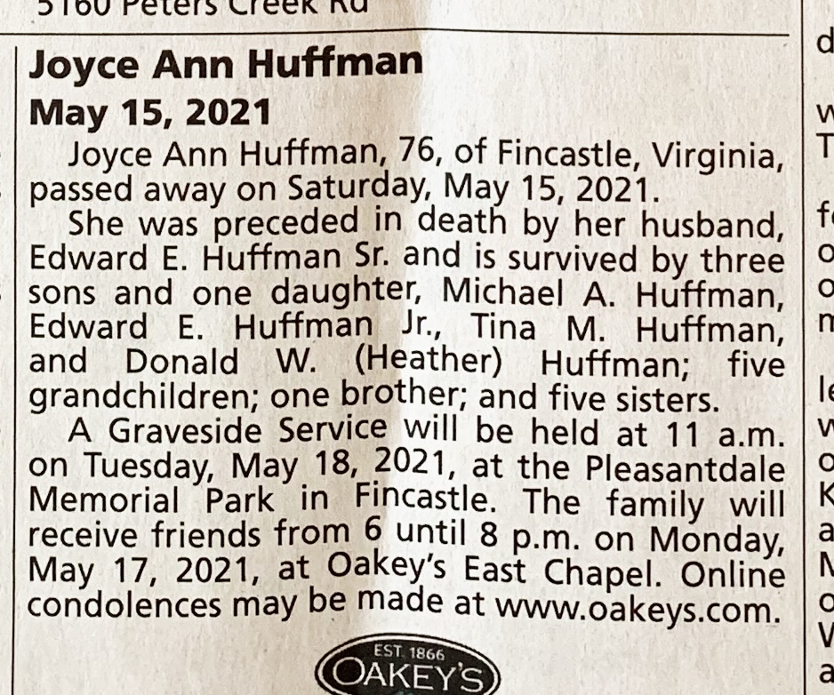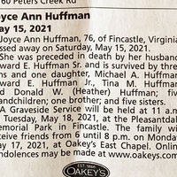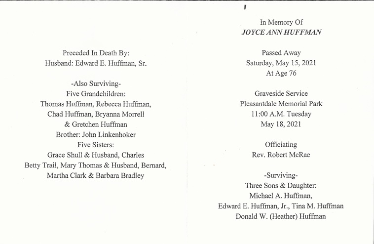 - Joyce Ann Linkenhoker Huffman was born May 8, 1945 to Luther Martin Linkenhoker and Leona Easter Pullen Linkenhoker. She married Edward E. Huffman, Sr, and had children, Michael A. Huffman, Edward E. Huffman, Jr., Tina M. Huffman, and Donald W. Huffman. She died May 15, 2021 and is buried at Pleasant Dale Memorial Park.