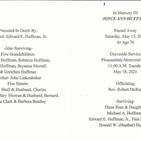 - Huffman, Joyce Ann Linkenhoker, 1945 - 2021