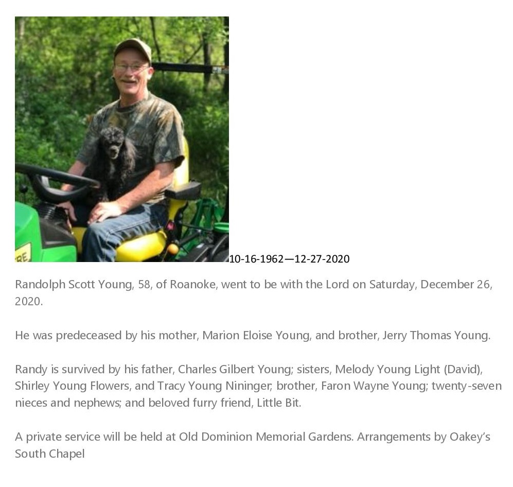 - Randolph Scott Young, of Roanoke, was born on October 16, 1962 to Marion Eloise Young and Charles Gilbert Young. He died on December 27, 2020, and is buried in Old Dominion Memorial Gardens.