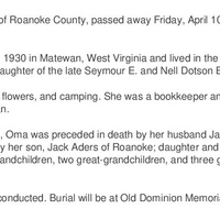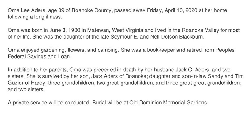- Oma Lee Aders was born in Matewan, West Virginia on June 3, 1930 to Seymour E. and Nell Dotson Blackburn. She married Jack C. Aders. They had two children, Jack C. Aders and Sandy Guzior. Oma Aders died on April 10, 2020, and is buried in Old Dominion Memorial Gardens. She lived in Roanoke County.