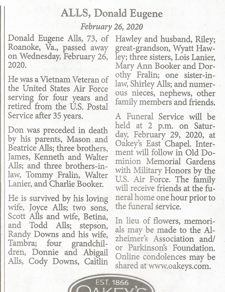 - Donald Eugene Alls, of Roanoke, was born to Mason and Beatrice Alls. He married Joyce Alls. They had two children, Scott and Todd, and a stepchild, Randy Downs. Donald Alls died on February 26, 2020, and is buried in Old Dominion Memorial Gardens.