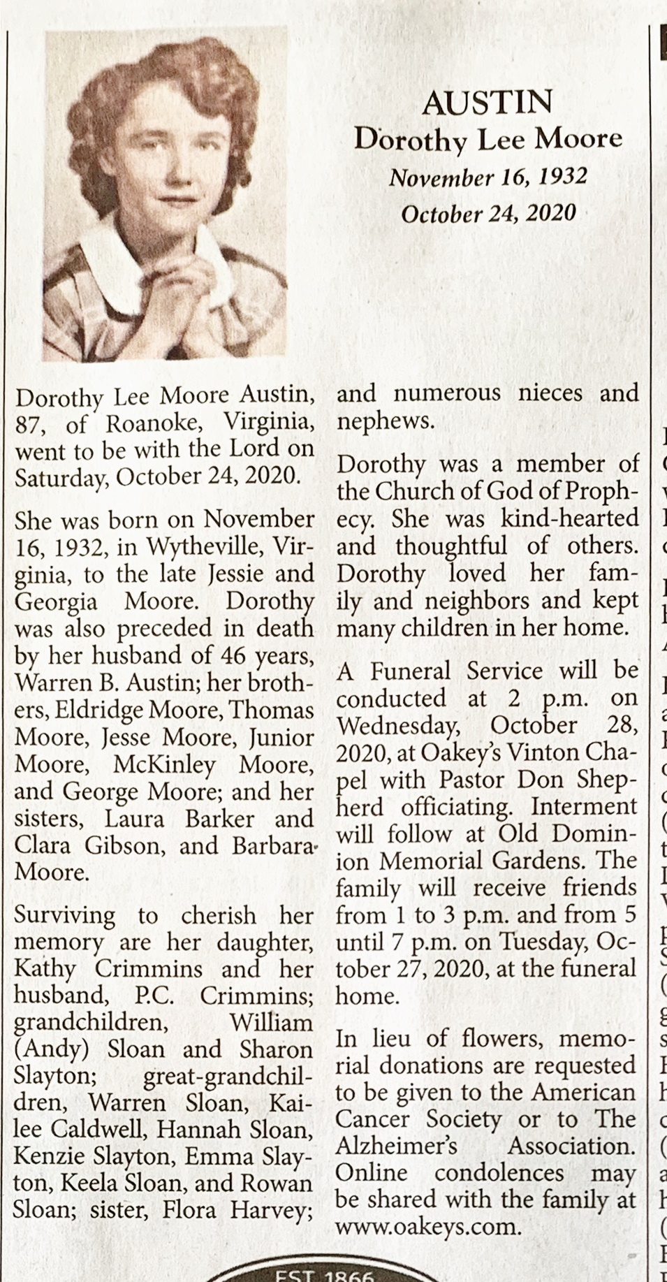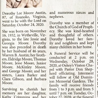 - Dorothy Lee Moore Austin was born on November 16, 1932 in Wytheville to Jessie and George Moore. She married Warren B. Austin. They had one child, Kathy Crimmins. Dorothy Austin died on October 24, 2020, and is buried in Old Dominion Memorial Gardens. She lived in Roanoke.
