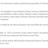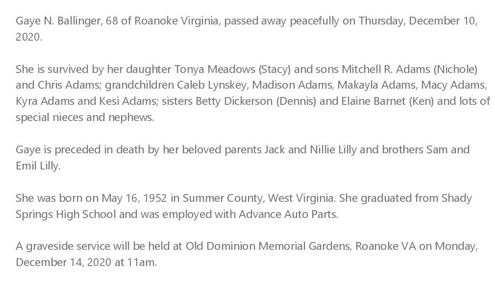 - Gaye N. Ballinger was born on May 16, 1952 in Summer County, West Virginia to Jack and Nillie Lilly. She had three children: Tonya Meadows, Mitchell R. Adams, and Chris Adams. Gaye Ballinger died on December 10, 2020, and is buried in Old Dominion Memorial Gardens. She lived in Roanoke.