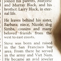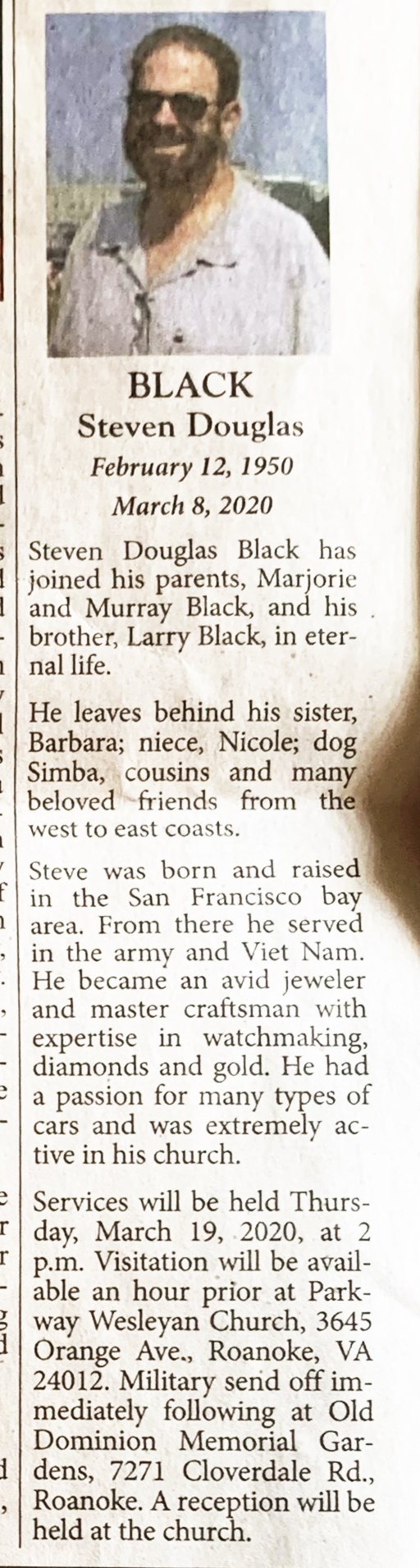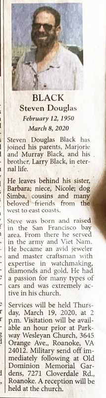 - Steven Douglas Black was born on February 12, 1950 in San Francisco Bay to Marjorie and Murray Black. Steven Black died on March 8, 2020, and is buried in Old Dominion Memorial Gardens.