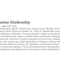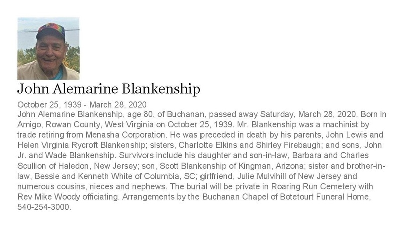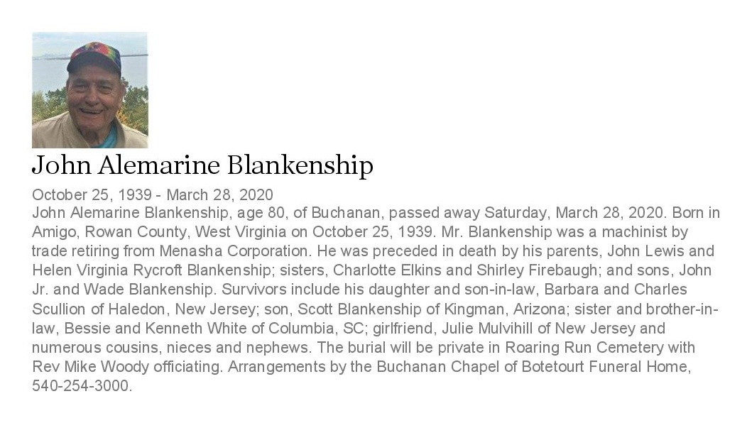 - John Alemarine Blankenship was born on October 25, 1939 in Amigo, Rowan County, West Virginia to John Lewis and Helen Blankenship. He was in a relationship with Julie Mulvihill. He had four children: John Jr., Wade Blankenship, Barbara Scullion, and Scott Blankenship. John Blankenship died on March 28, 2020, and is buried in Roaring Run Cemetery.