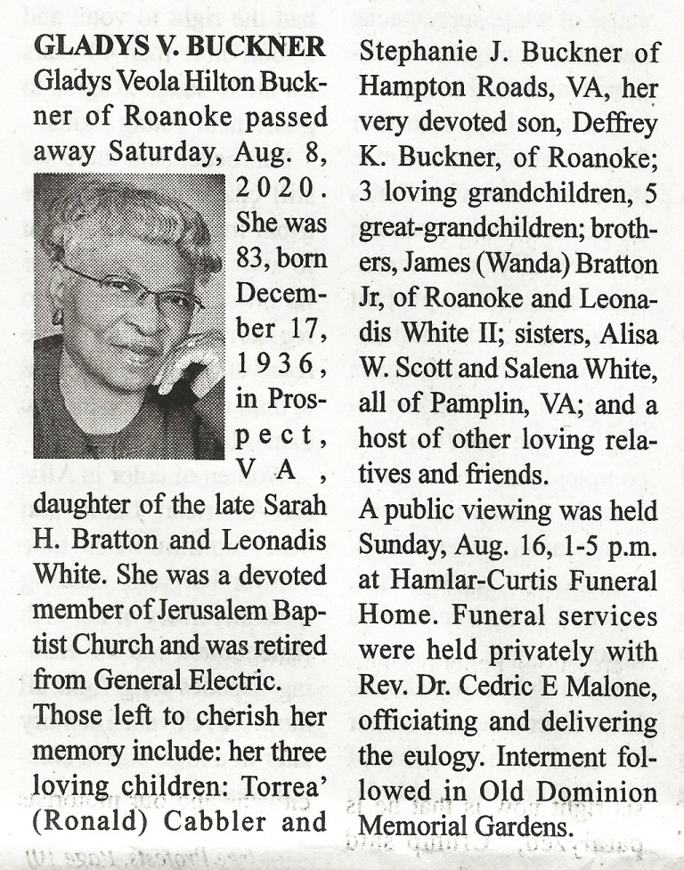 - Gladys Veola Hilton Buckner was born on December 17, 1936 in Prospect, Virginia to Sarah H. Bratton and Leonadis White. She had three children, Torrea Cabbler, Stephanie J. Buckner, and Deffrey K. Buckner. Gladys Buckner died on August 8, 2020, and is buried in Old Dominion Memorial Gardens. She lived in Roanoke.