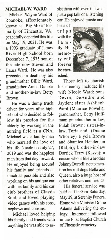 - Michael Wayne Ward, known as "Big Mike", was born on December 7, 1975 to Steven and Laura Ward. He married Nicole on July 27, 2019. He had three children: Devin, DeAndre, and Jayden. Michael Ward died on May 19, 2021, and is buried in First Baptist Church of Fincastle. He lived in Roanoke, but previously in Fincastle.
