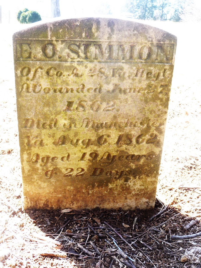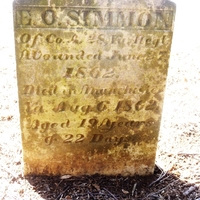 Edmond O. Simmons was born July 14, 1843 to Anthony Kessler Simmons and Sophia Bower Simmons. He served in the Confederate Army, and died August 6, 1862. He is buried at Brugh-Simmons Cemetery.
