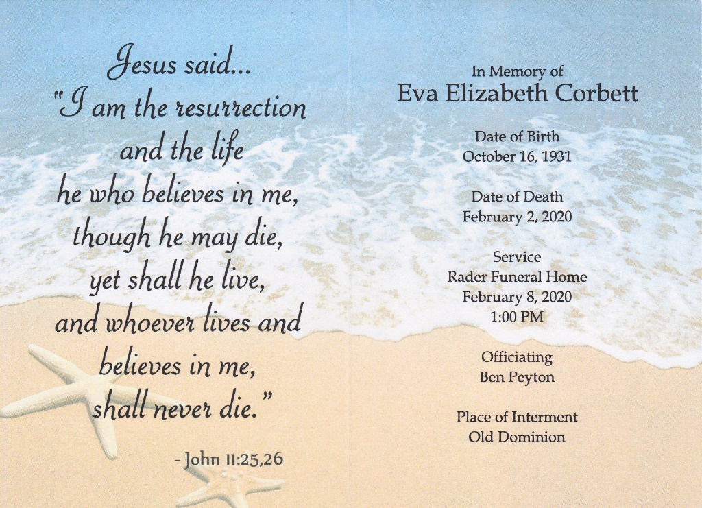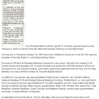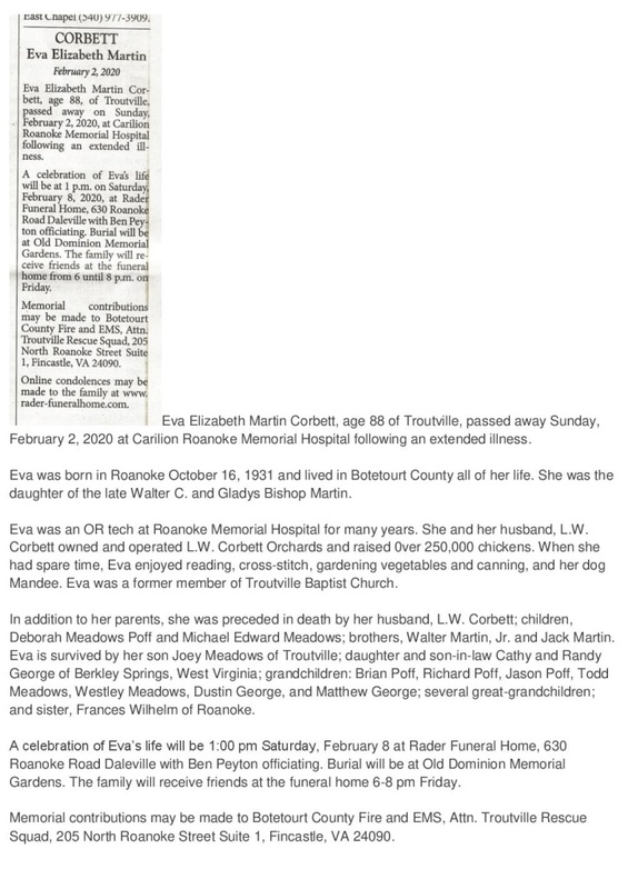 - Eva Elizabeth Martin Corbett was born on October 16, 1931 in Roanoke to Walter C. and Gladys Bishop Martin. She married L.W. Corbett. They had four children: Deborah Meadows Poff, Michael Edward Meadows, Joey Meadows, and Cathy George. Eva Corbett died on February 2, 2020, and is buried in Old Dominion Memorial Gardens. She lived in Troutville.
