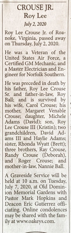 - Roy Lee Crouse Jr. was born to Roy Crouse Sr. and Margaret Venable Crouse. He had two children, Michele Adams and Roy Crouse III. Roy Crouse Jr. died on July 2, 2020, and is buried in Old Dominion Memorial Gardens. He lived in Roanoke.