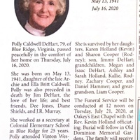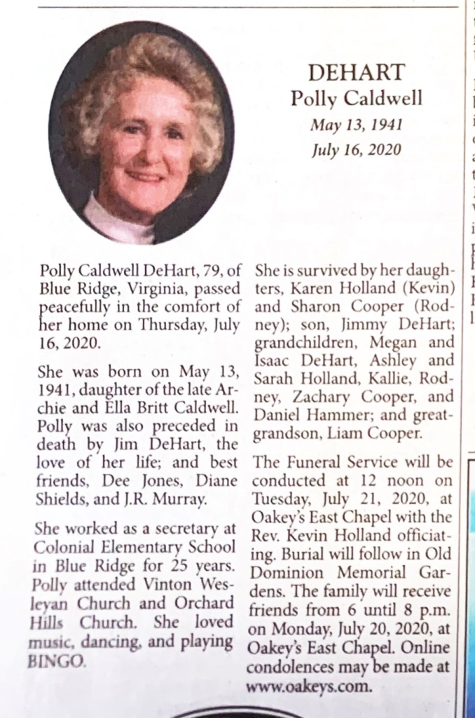 - Polly Cadwell DeHart, of Blue Ridge, was born on May 13, 1941 to Archie and Ella Britt Caldwell. She married Jim DeHart. They had three children: Karen Holland, Sharon Cooper, and Jimmy DeHart. Polly DeHart died on July 16, 2020, and is buried in Old Dominion Memorial Gardens. She lived in Blue Ridge.