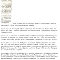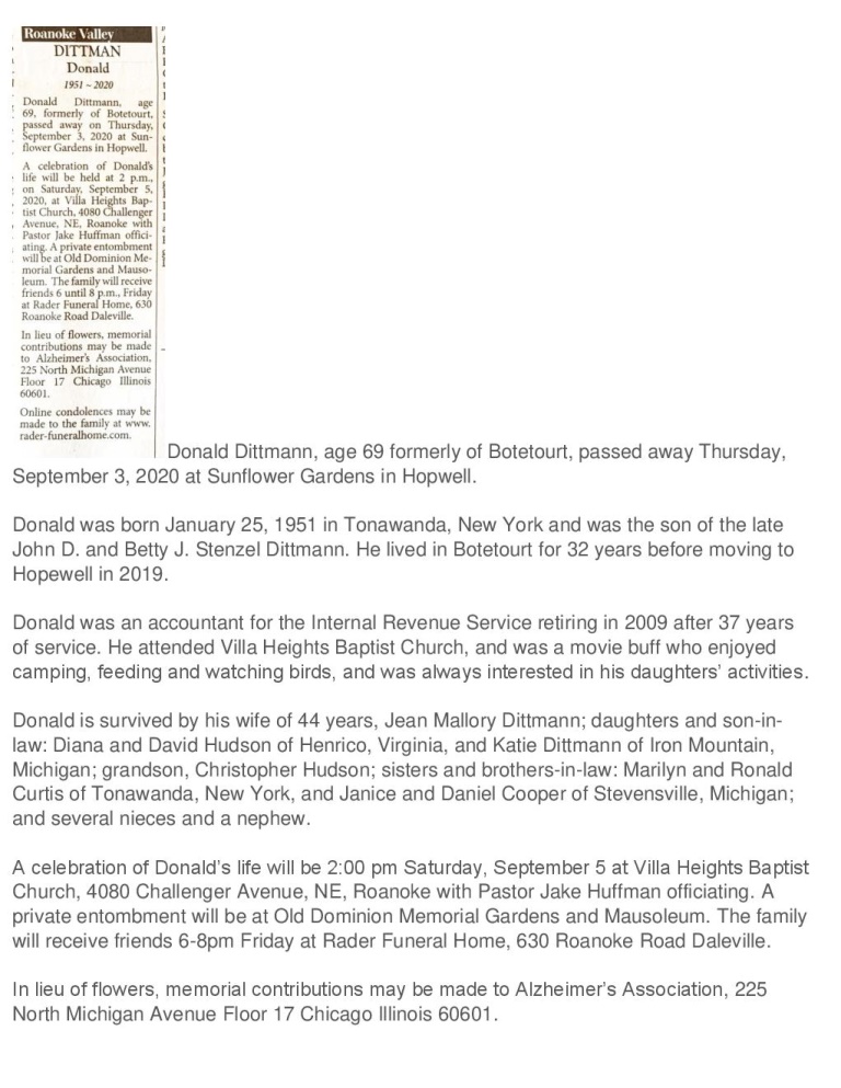 - Donald Dittman, formerly of Botetourt, was born on January 25, 1951 in Tonawanda, New York to John D. and Betty J. Stenzel Dittmann. He married Jean Dittmann. They had two children, Diana and Katie. Donald Dittmann died on September 3, 2020, and is buried in Old Dominion Memorial Gardens.