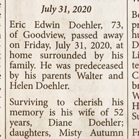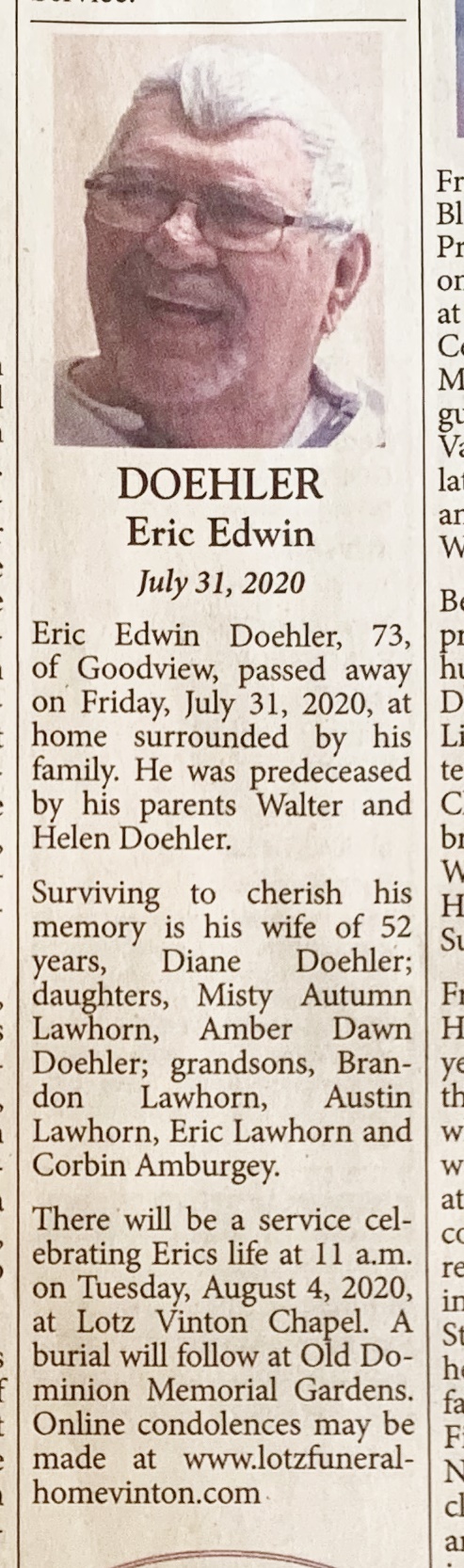 - Eric Edwin Doehler was born in 1946 to Walter and Helen Doehler. He married Diane Doehler. They had two children, Misty Autumn Lawhorn and Amber Dawn Doehler. Eric Doehler died on July 31, 2020, and is buried in Old Dominion Memorial Gardens. He lived in Goodview.