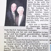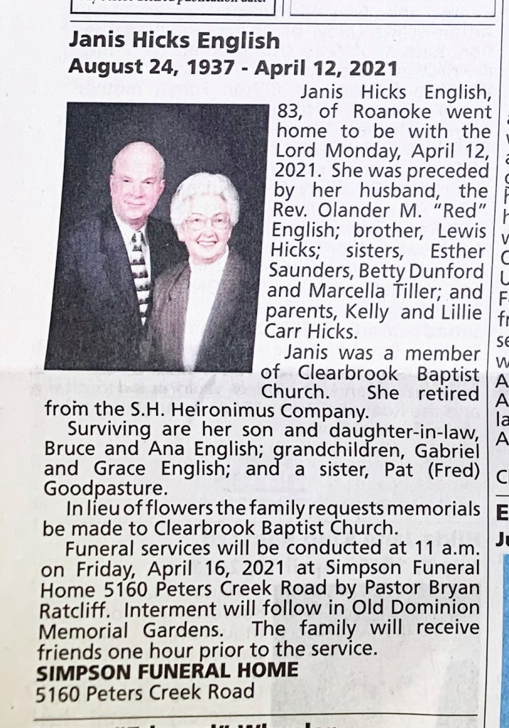 - Janis Hicks English was born on August 24, 1937 to Kelly and Lillie Carr Hicks. She married Rev. Olander M. "Red" English. She had a son, Bruce English. Janis English died on April 12, 2021, and is buried in Old Dominion Memorial Gardens. She lived in Roanoke.
