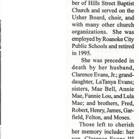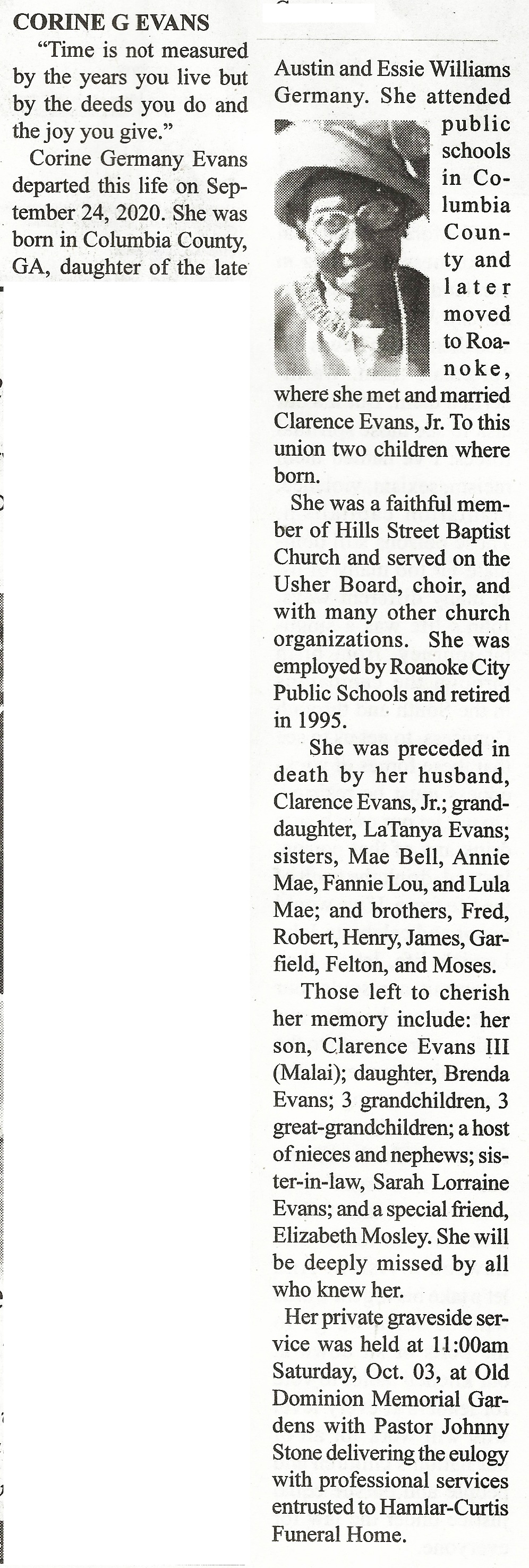 - Corine Germany Evans was born to Austin and Essie Williams Germany. She married Clarence Evans, Jr. They had two children, Clarence III and Brenda Evans. Corine Evans died on September 24, 2020, and is buried at Old Dominion Memorial Gardens.