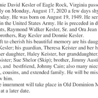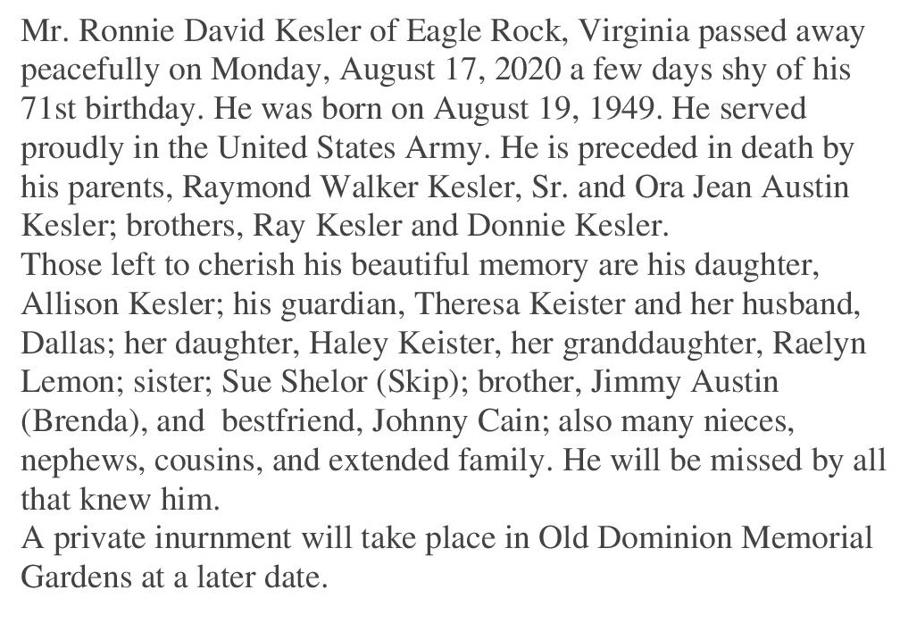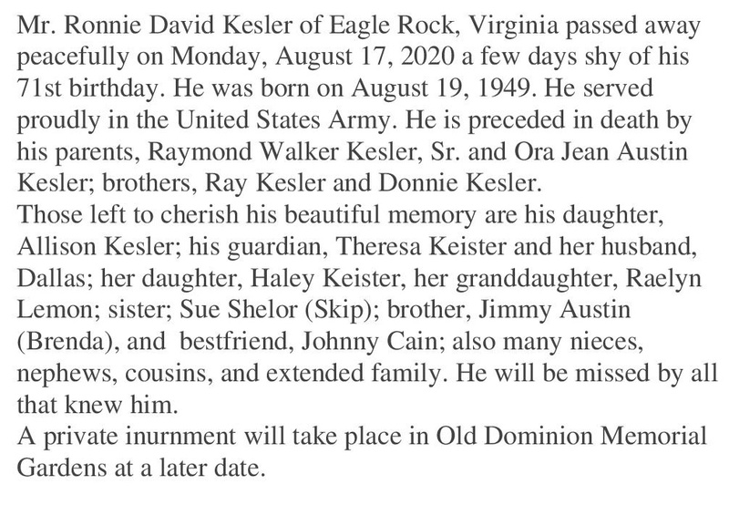 - Ronnie David Kesler, of Eagle Rock, was born on August 19, 1949 to Raymond Walker Kesler, Sr. and Ora Jean Austin Kelser. He had one daughter, Allison Kesler. Ronnie Kesler died on August 17, 2020, and is buried in Old Dominion Memorial Gardens.