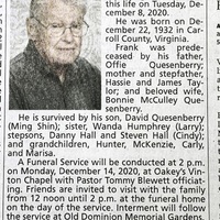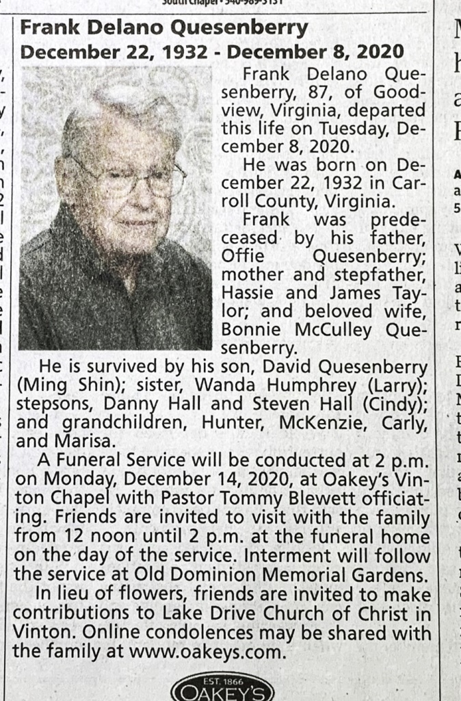 - Frank Delano Quesenberry was born on December 22, 1932 in Carroll County to Offie Quesenberry and Hassie Taylor. His stepfather was James Taylor. He married Bonnie McCulley Quesenberry. They had one child, David Quesenberry, and two stepchildren, Danny and Steven. Frank Quesenberry died on December 8, 2020, and is buried in Old Dominion Memorial Gardens. He lived in Goodview.