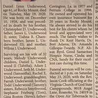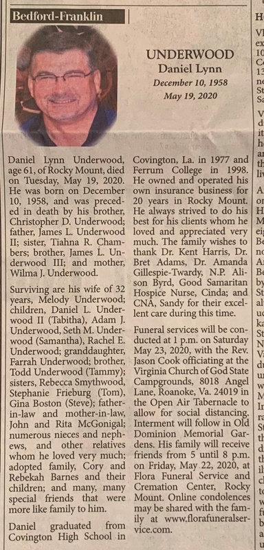 - Daniel Lynn Underwood was born on December 12, 1958 to James L. Underwood and Wilma J. Underwood. He married Melody Underwood. They had four children: Daniel II, Seth, Adam, and Rachel. Daniel Underwood died on May 19, 2020, and is buried in Old Dominion Memorial Gardens. He lived in Rocky Mount.