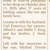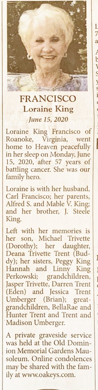 - Loraine King Francisco, of Roanoke, was born to Alfred S. and Mable V. King. She married Carl Francisco. They had two children, Michael Trivette and Deana Trivette Trent. Loraine Francisco died on June 15, 2020, and is buried in Old Dominion Memorial Gardens. She lived in Roanoke.