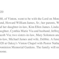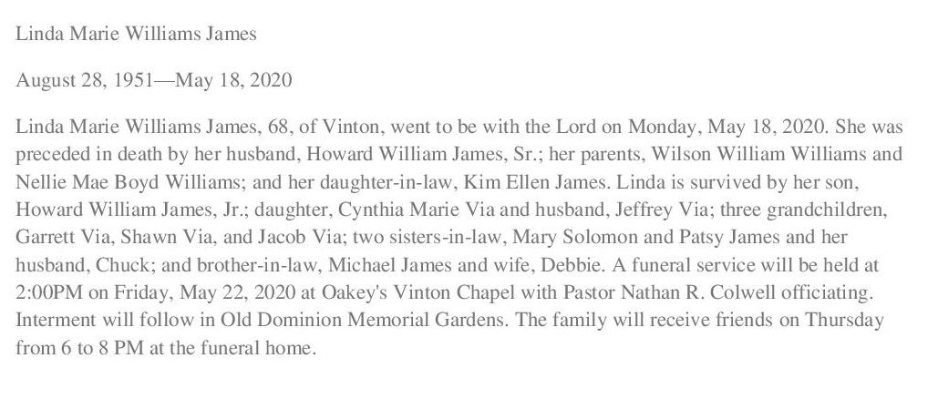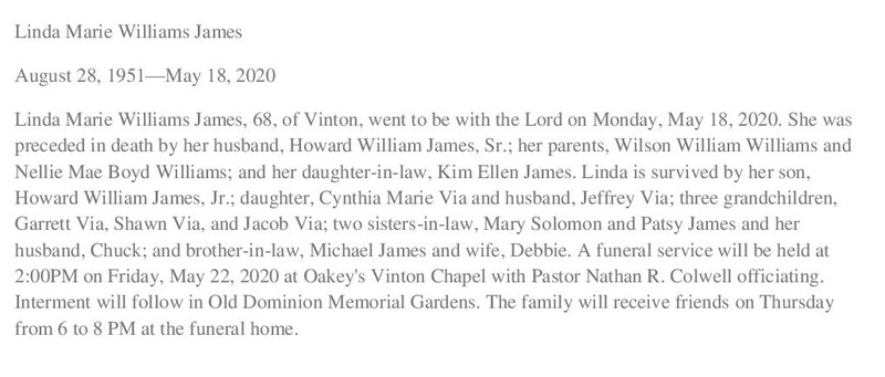 - Linda Marie Williams James, of Vinton, was born on August 28, 1951 to Wilson William Williams and Nellie Mae Boyd Williams. She married Howard William James, Sr. They had two children, Howard William James, Jr. and Cynthia Marie Via.