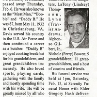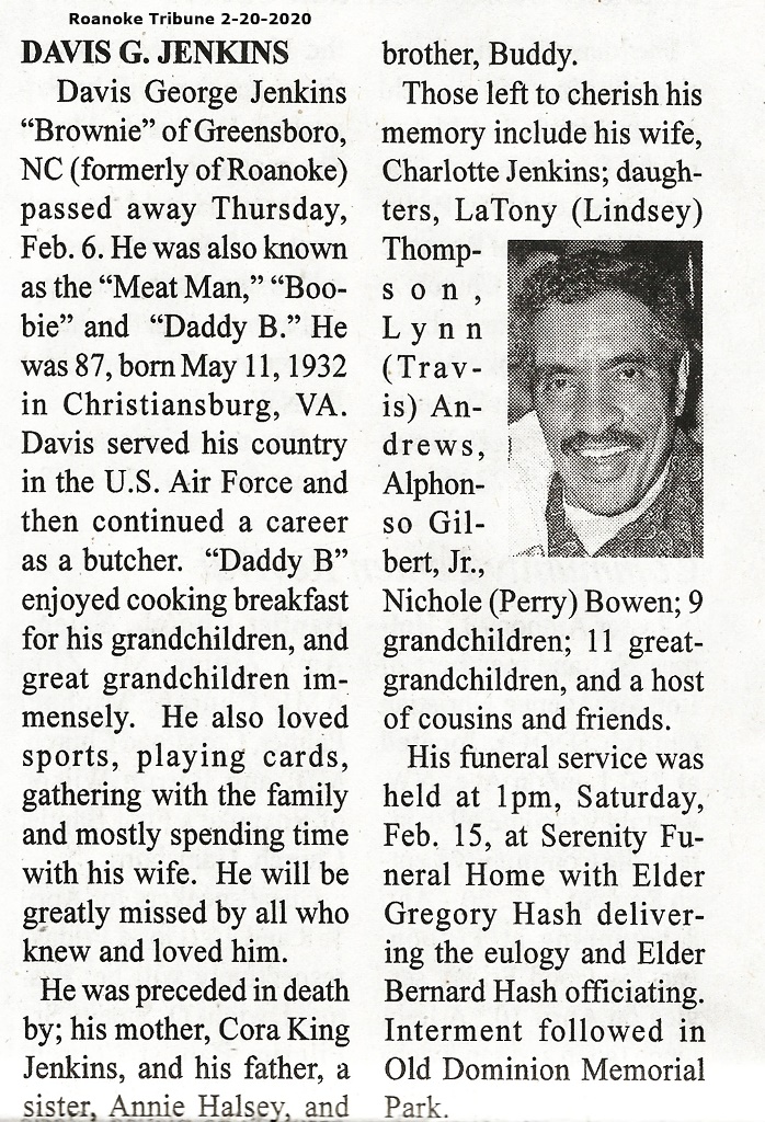 - Davis George Jenkins "Brownie", also known as "Meat Man," "Boobie," and "Daddy B", was born on May 11, 1932 in Christiansburg to Cora King Jenkins and his father. He married Charlotte Jenkins. They had three children: LaTony Thompson, Lynn Andrews, Alphonso Gilbert, Jr. Davis Jenkins died on February 6, 2020, and is buried in Old Memorial Gardens. He lived in Greensboro, North Carolina, but previously in Roanoke.