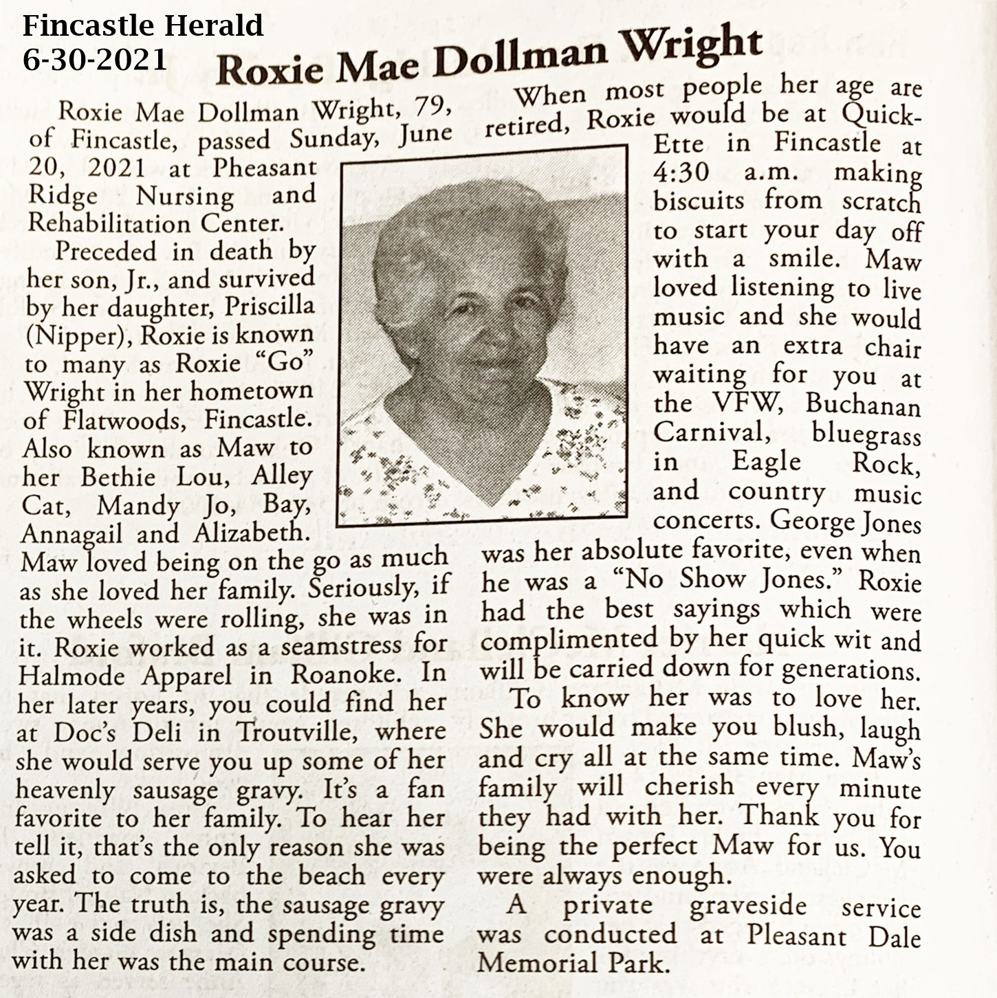 - Wright, Roxie Mae Dollman, 1941 - 2021