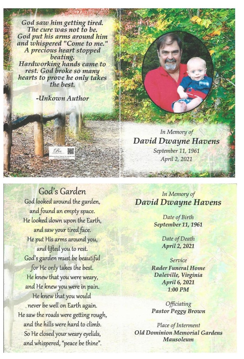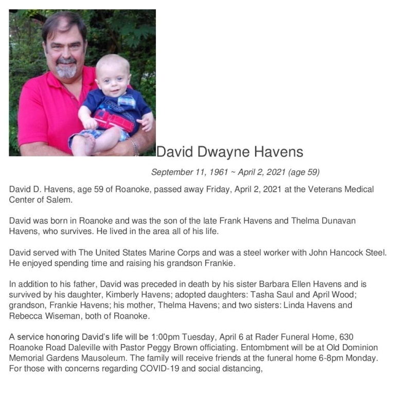 - David Dwayne Havens was born on September 11, 1961 in Roanoke to Frank Havens and Thelma Dunavan Havens. He has three daughters, Kimberly Havens, Tasha Saul, and April Wood. David Havens died on April 2, 2021, and is buried in Old Dominion Memorial Gardens. He lived in Roanoke.