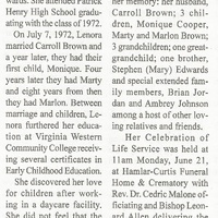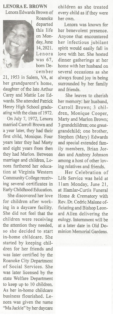 - Lenora Edwards Brown was born on December 21, 1953 in Salem to Arthur Carey and Mattie Lee Edwards. She married Carroll Brown on July 7, 1972. She has three children: Monique, Marty, and Marlon. Lenora Brown died on June 14, 2021, and is buried in Old Dominion Memorial Gardens. She lived in Roanoke.