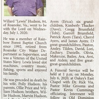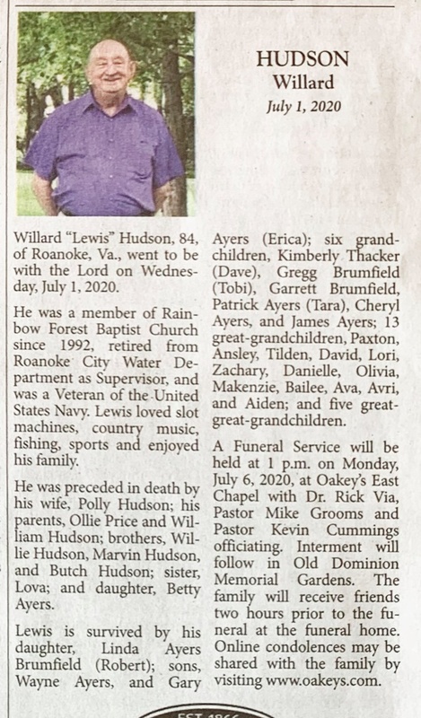 - Willard "Lewis" Hudson was born in 1936 to Ollie Price and William Hudson. He married Polly Hudson. They had four children: Betty Ayers, Linda Ayers Brumsfield, Wayne Ayers, and Gary Ayers. Willard Hudson died on July 1, 2020, and is buried in Old Dominion Memorial Gardens. He lived in Roanoke.