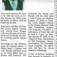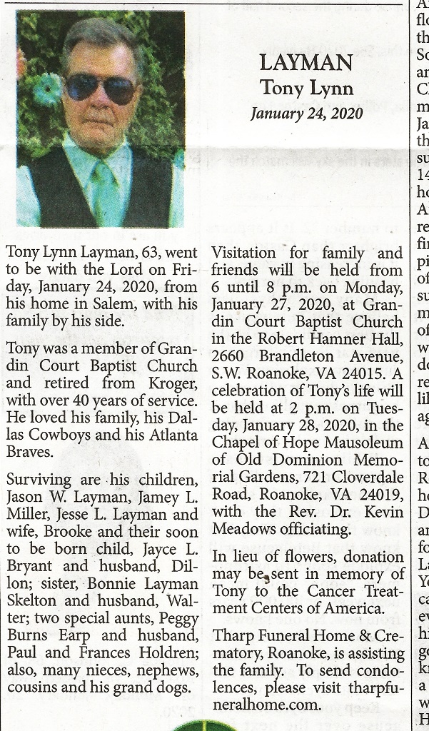 - Tony Lynn Layman was born in 1957. He had three children, Jason W. Layman, Jamey L. Miller, and Jesse L. Layman. Tony Layman died on January 24, 2020, and is buried in Old Dominion Memorial Gardens. He lived in Salem.