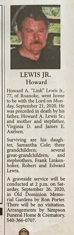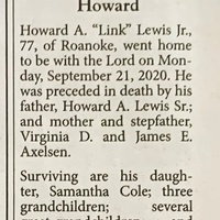 - Howard A. "Link" Lewis Jr. was born to Howard A. Lewis, Sr. and Virginia D. Axelson. His stepfather was James E. Axelson. He has one child, Samantha Cole. Howard Lewis Jr. died on September 21, 2020, and is buried in Old Dominion Memorial Gardens. He lived in Roanoke.