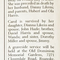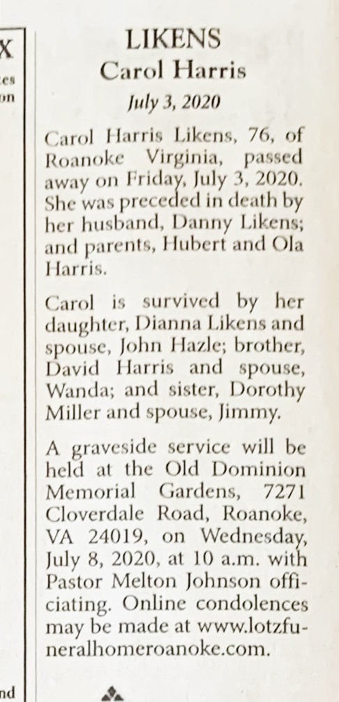 - Carol Harris Likens, of Roanoke, was born to Hubert and Ola Harris. She married Danny Likens. They had one child, Dianna. Carol Likens died on July 3, 2020, and is buried in Old Dominion Memorial Gardens. She lived in Roanoke.