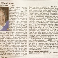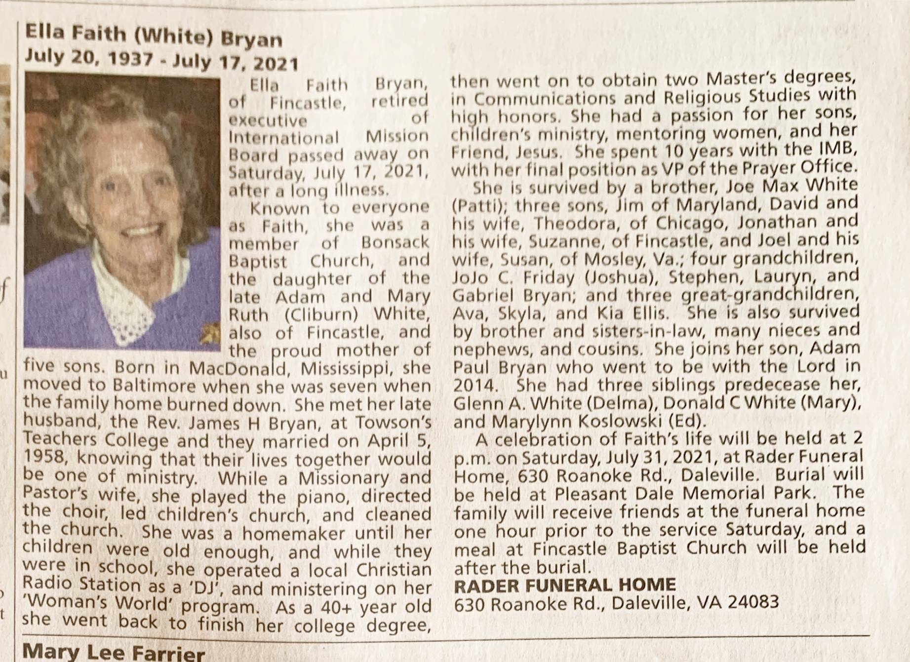 - Ella Faith (White) Bryan was born on July 20, 1937 in MacDonald, Mississippi to Adam and Mary Ruth (Cliburn) White. She married Rev. James H. Bryan on April 5, 1958. They had three children, Jim, David, and Jonathan. Ella Bryan died on July 17, 2021, and is buried at Pleasant Dale Memorial Park. She lived in Fincastle.