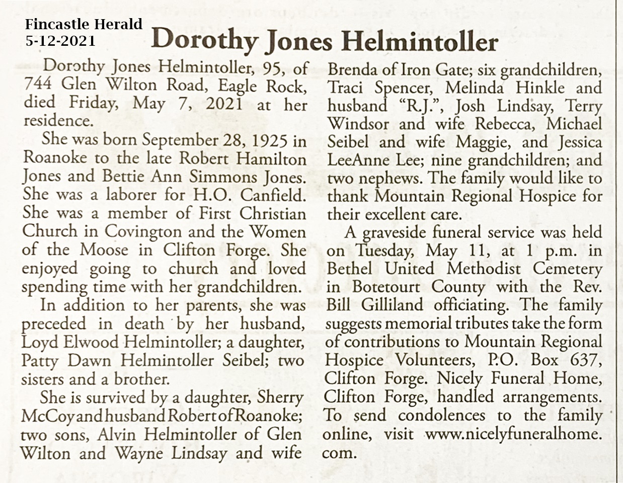 - Dorothy Jones Helmintoller was born on September 28, 1925 in Roanoke to Robert Hamilton Jones and Bettie Ann Simmons Jones. She married Loyd Elwood Helmintoller. They had four children: Patty Dawn Helmintoller Seibel, Sherry McCoy, Alvin Helmintoller, and Wayne Lindsay. Dorothy Helmintoller died on May 7, 2021. She lived in Eagle Rock.