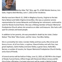 - Marilyn Mae "Bo" Bliss was born on March 15, 1946 in Alleghany County to Harry Nelson and Hallie Virginia Unroe Bliss. She had two sisters, Evelyn and Carolyn. Marilyn Bliss died on June 7, 2021, and is buried in Bethel United Methodist Cemetery. She lived in Iron Gate.