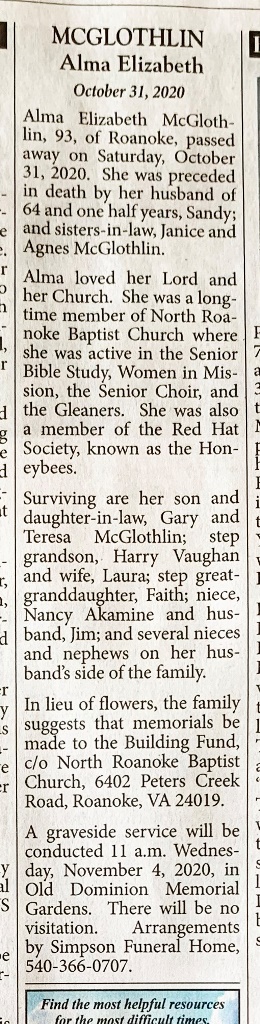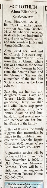 - Alma Elizabeth McGlothlin, of Roanoke, was born in 1927. She was married. She had one child, Gary. Alma McGlothlin died on October 31, 2020, and is buried in Old Dominion Memorial Gardens.